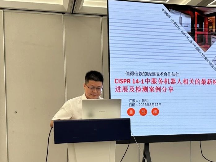 威凯检测技术有限公司广州 EMC 试验室副主任陈钧分享《CISPR 14 - 1 中服务机器人相关的最新标准进展及检测案例分享》。