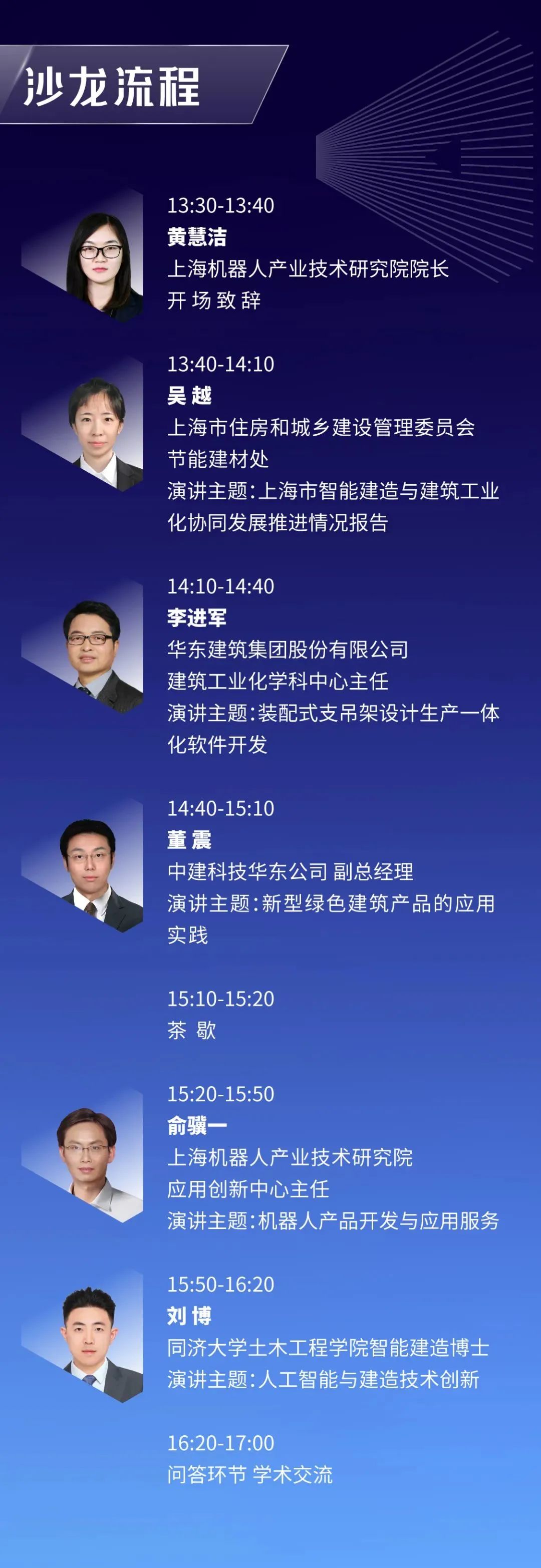 本次沙龙特邀上海市住房和城乡建设管理委员会节能建材处、leyu.乐鱼(集团)机器人有限公司官网、中建科技、华建集团、 同济大学土木工程学院五位大咖与大家深度分享智能建造技术与产业协同,产品与项目实践,创新与发展融合。
