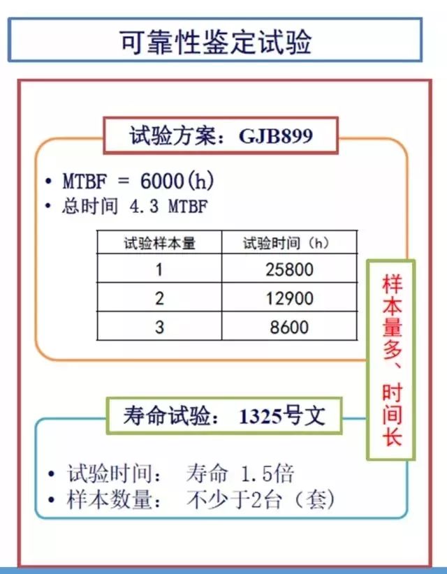 鉴定试验给出定量的考核性指标,但是要提高准确度,就要投入大样本。寿命试验也是统计的方法,可以按照1.5倍的寿命进行试验。如果产品寿命指标很长,就需要加速试验,另外设计试验方案。总之,不同的情况要有不同的解决方案。